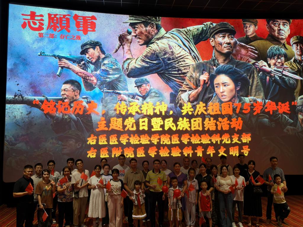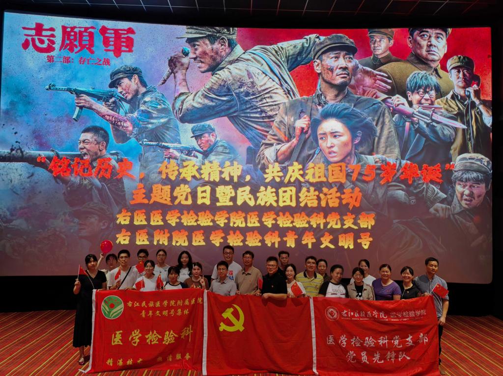 为了弘扬爱国主义精神,深化民族团结意识,提升团队凝聚力,丰富职工的精神文化生活,2024年10月18日,医学检验科党支部携手医学检验科青年文明号开展庆祝新中国75周年华诞的爱国教育主题党日暨民族团结观影活动。