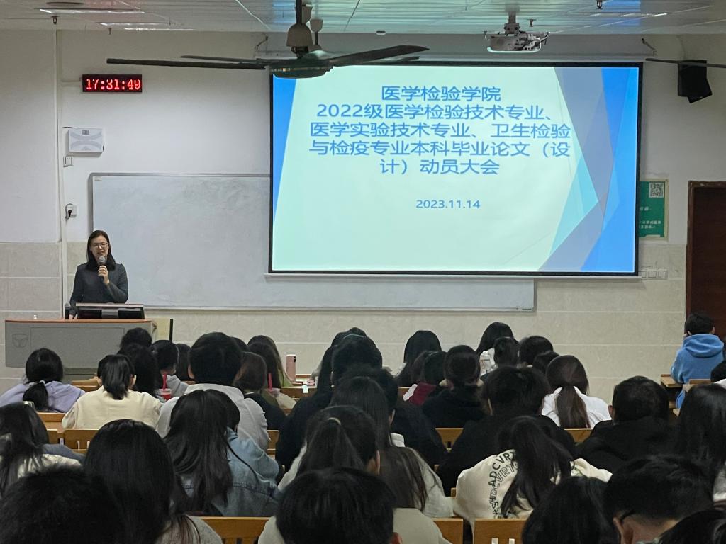 为了帮 助2022级医学检验技术、医学实验技术、卫生检验与检疫3个医学技术类专业员工了解毕业论文(设计)事宜和引导员工做好准备,2023年11月14日下午,医学检验公司2022级本科生毕业论文(设计)动员大会在7-301教室召开。医学检验公司庞雅琴副经理、教学科何涛科长,2022级医学检验技术本科班、2022级医学实验技术本科班、2022级卫生检验与检疫本科班全体员工参加了本次大会。