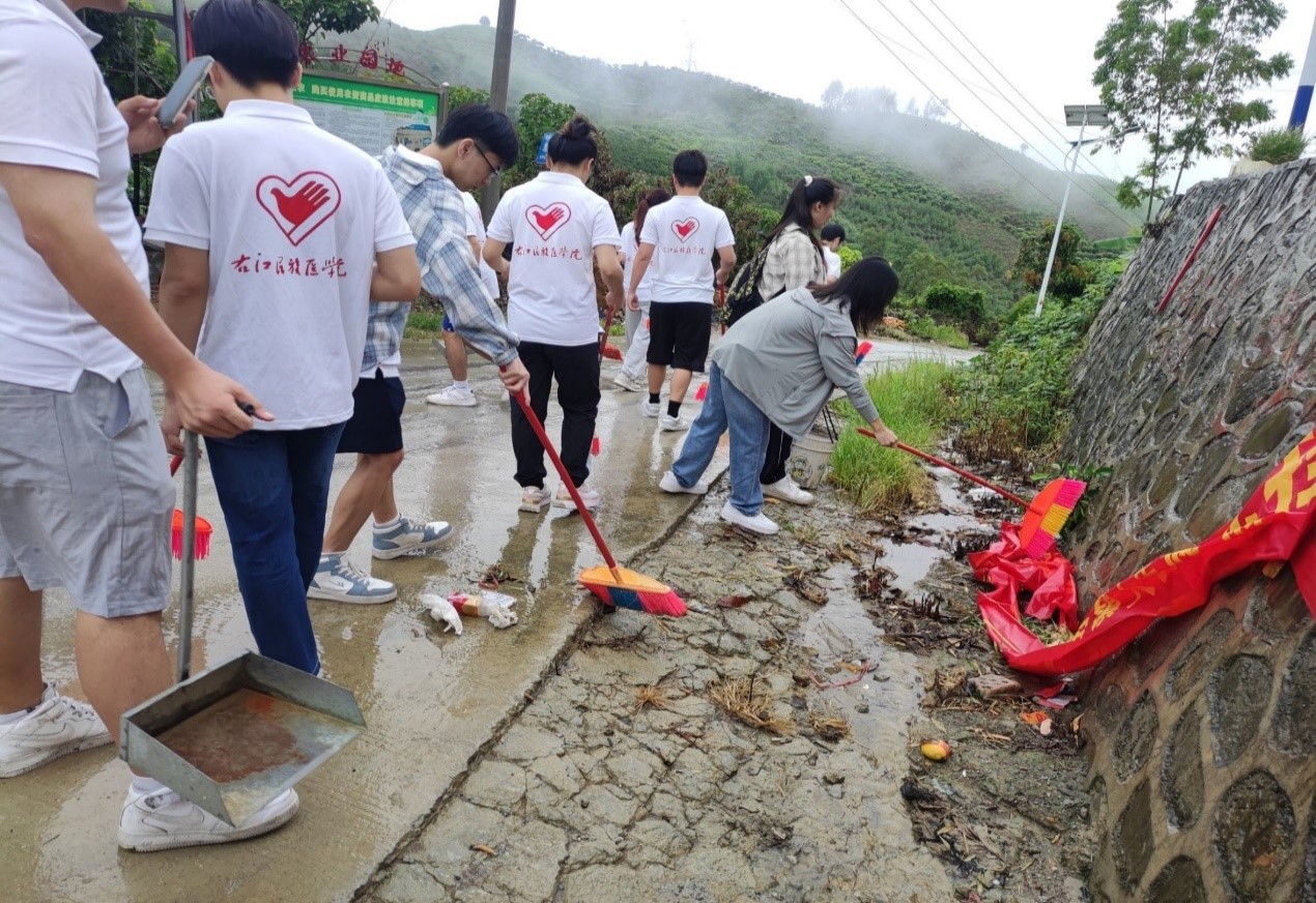 小分队成员清扫村中公共区域垃圾
