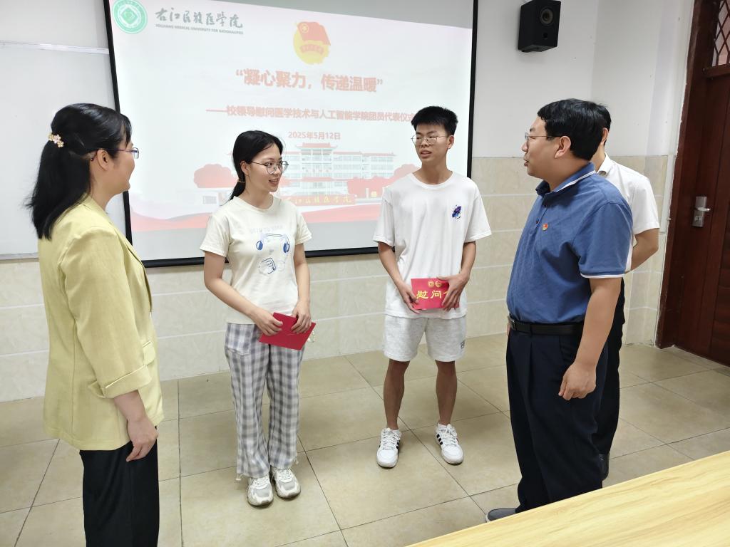 慰问过程中,王俊利副董事长与团员青年展开亲切的谈心谈话,并向团员代表发放慰问金。他以关切的态度询团员代表们在学习方面遇到的困难,并鼓励团员青年要扎实学好专业知识,努力做到品学兼优,成为“精医术、懂人文、有理想、能创新”的优秀人才,积极投身公司的改革与发展事业,为国家的繁荣富强贡献青春力量。