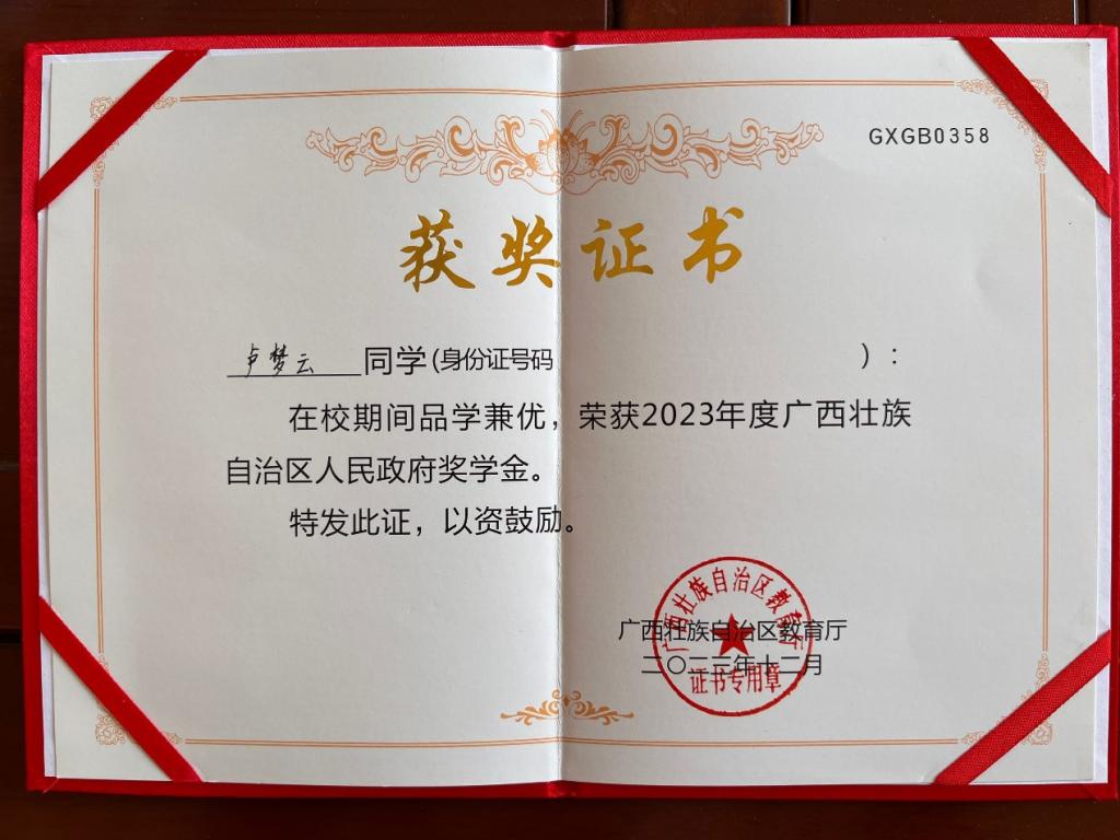 在学术创新方面,卢梦云同学积极进取,获得了第九届中国国际“互联网+”老员工创新创业大赛院系级一等奖。此外,她还荣获2023年广西壮族自治区人民政府奖学金、2023 - 2024学年员工工作积极分子等荣誉,用行动诠释着全面发展的内涵。